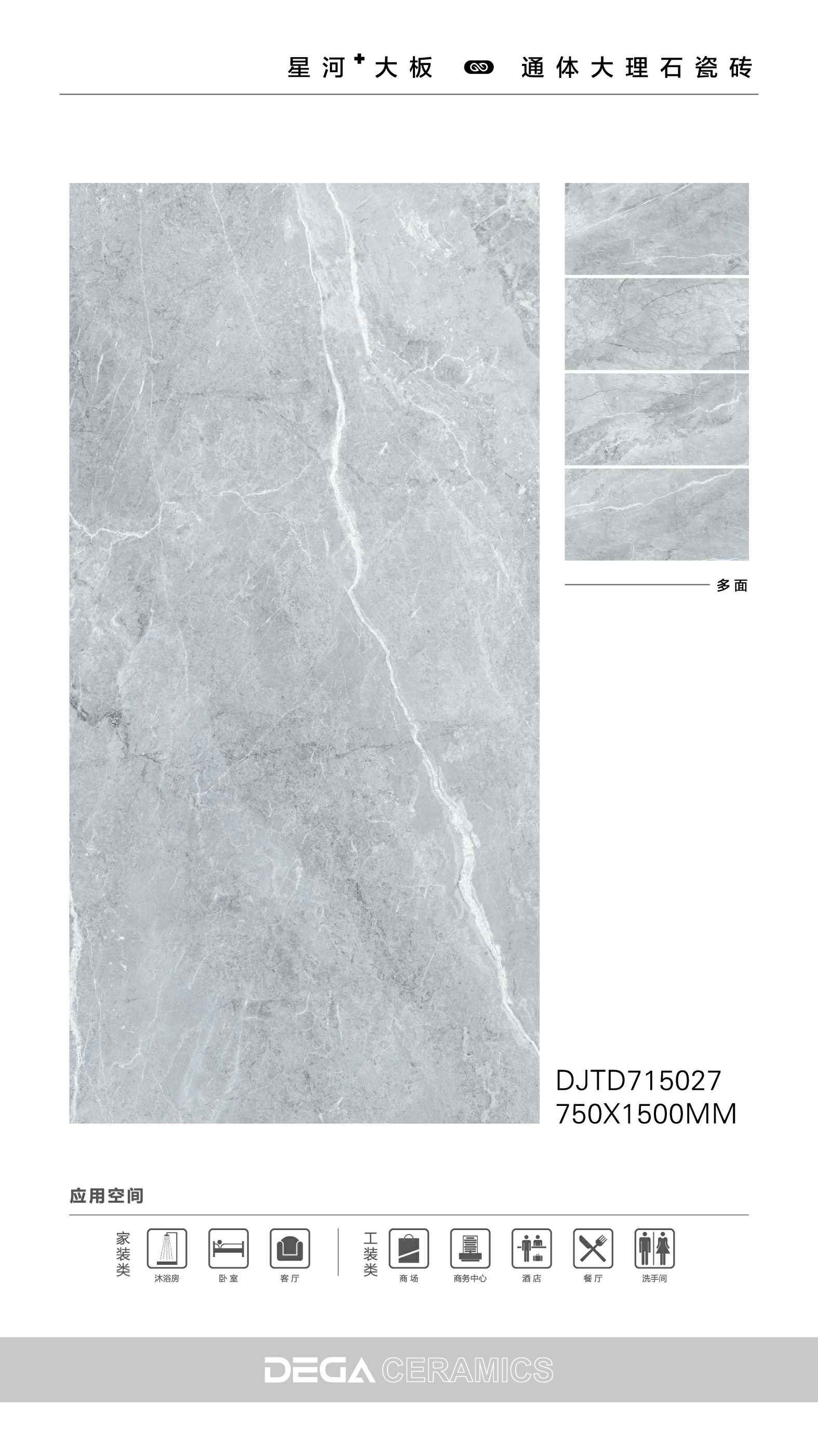 从规格形式的选择、纹理的趣味,到丰富内涵的表现、文化的传承等…… 都是她的每一侧面,在750X1500MM创造的舞台中央,是属于一片瓷砖传奇剧的演出。